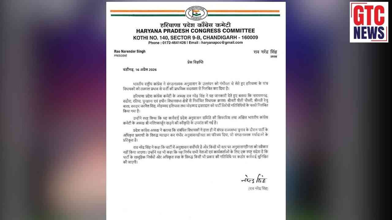 ਭਾਰਤੀ ਰਾਸ਼ਟਰੀ ਕਾਂਗਰਸ ਨੇ ਜਥੇਬੰਦਕ ਅਨੁਸ਼ਾਸਨ ਦੀ ਉਲੰਘਣਾ ਨੂੰ ਗੰਭੀਰਤਾ ਨਾਲ ਲੈਂਦਿਆਂ ਹਰਿਆਣਾ ਦੇ ਪੰਜ ਵਿਧਾਇਕਾਂ ਨੂੰ ਤੁਰੰਤ ਪ੍ਰਭਾਵ ਨਾਲ ਪਾਰਟੀ ਦੀ ਮੁੱਢਲੀ ਮੈਂਬਰਸ਼ਿਪ ਤੋਂ ਮੁਅੱਤਲ ਕਰ ਦਿੱਤਾ ਹੈ। ਹਰਿਆਣਾ ਪ੍ਰਦੇਸ਼ ਕਾਂਗਰਸ ਕਮੇਟੀ ਦੇ ਪ੍ਰਧਾਨ ਰਾਓ ਨਰਿੰਦਰ ਸਿੰਘ ਨੇ ਇਹ ਜਾਣਕਾਰੀ ਦਿੰਦਿਆਂ ਦੱਸਿਆ ਕਿ ਨਰਾਇਣਗੜ੍ਹ ਤੋਂ ਸ਼ੈਲੀ ਚੌਧਰੀ, ਸਢੌਰਾ ਤੋਂ ਰੇਣੂ ਬਾਲਾ, ਰਤੀਆ ਤੋਂ ਸਰਦਾਰ ਜਰਨੈਲ ਸਿੰਘ, ਪੁਨਹਾਨਾ ਤੋਂ ਮੁਹੰਮਦ ਇਲਿਆਸ ਅਤੇ ਹਥੀਨ ਤੋਂ ਮੁਹੰਮਦ ਇਜ਼ਰਾਈਲ ਨੂੰ ਪਾਰਟੀ ਵਿਰੋਧੀ ਗਤੀਵਿਧੀਆਂ ਕਾਰਨ ਮੁਅੱਤਲ ਕੀਤਾ ਗਿਆ ਹੈ।