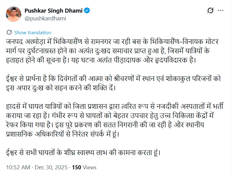 ਮੁੱਖ ਮੰਤਰੀ ਧਾਮੀ ਨੇ X 'ਤੇ ਪੋਸਟ ਕੀਤਾ ਕਿ "ਬਿਖਿਆਸੈਨ-ਵਿਨਾਇਕ ਮੋਟਰ ਰੋਡ 'ਤੇ ਬੱਸ ਹਾਦਸੇ ਦੀ ਬਹੁਤ ਹੀ ਦੁਖਦਾਈ ਖ਼ਬਰ ਮਿਲੀ ਹੈ, ਜੋ ਕਿ ਅਲਮੋੜਾ ਜ਼ਿਲ੍ਹੇ ਦੇ ਬਿਖਿਆਸੈਨ ਤੋਂ ਰਾਮਨਗਰ ਜਾ ਰਹੀ ਸੀ, ਜਿਸ ਵਿੱਚ ਯਾਤਰੀਆਂ ਦੀ ਮੌਤ ਹੋ ਗਈ। ਇਹ ਘਟਨਾ ਬਹੁਤ ਦਰਦਨਾਕ ਅਤੇ ਦਿਲ ਦਹਿਲਾ ਦੇਣ ਵਾਲੀ ਹੈ।"