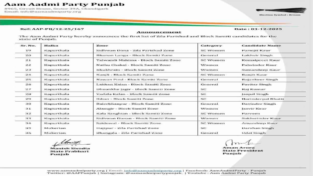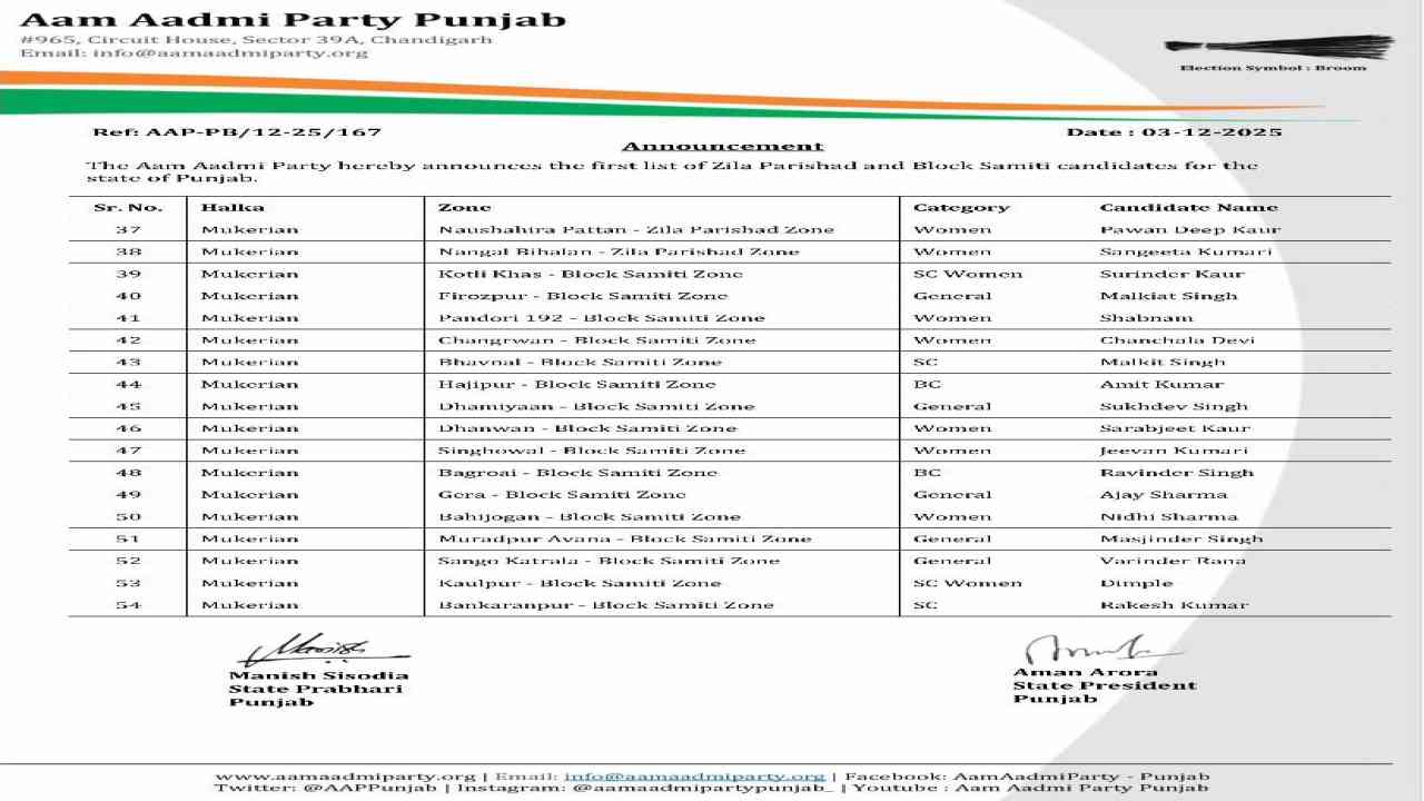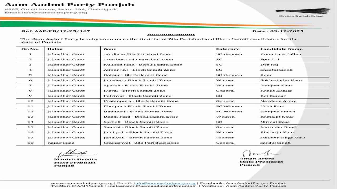 ਪੰਜਾਬ ਵਿੱਚ ਜ਼ਿਲ੍ਹਾ ਪ੍ਰੀਸ਼ਦ ਅਤੇ ਪੰਚਾਇਤ ਸੰਮਤੀ ਚੋਣਾਂ ਲਈ ਨੂੰ ਲੈ ਕੇ ਸਿਆਸੀ ਹਲਚਲ ਤੇਜ਼ ਹੋ ਗਈ ਹੈ । ਇਸੀਂ ਦੇ ਚੱਲਦਿਆਂ ਆਮ ਆਦਮੀ ਪਾਰਟੀ ਨੇ ਜ਼ਿਲ੍ਹਾ ਪ੍ਰੀਸ਼ਦ ਅਤੇ ਪੰਚਾਇਤ ਸੰਮਤੀ ਚੋਣਾਂ ਲਈ 961 ਉਮੀਦਵਾਰਾਂ ਦੀ ਆਪਣੀ ਪਹਿਲੀ ਸੂਚੀ ਜਾਰੀ ਕਰ ਦਿੱਤੀ ਹੈ। 22 ਜ਼ਿਲ੍ਹਾ ਪ੍ਰੀਸ਼ਦਾਂ ਅਤੇ 150 ਤੋਂ ਵੱਧ ਪੰਚਾਇਤ ਸੰਮਤੀਆਂ ਦੀਆਂ ਚੋਣਾਂ 14 ਦਸੰਬਰ ਨੂੰ ਹੋਣੀਆਂ ਹਨ ਅਤੇ ਨਤੀਜੇ 17 ਦਸੰਬਰ ਨੂੰ ਐਲਾਨੇ ਜਾਣਗੇ।