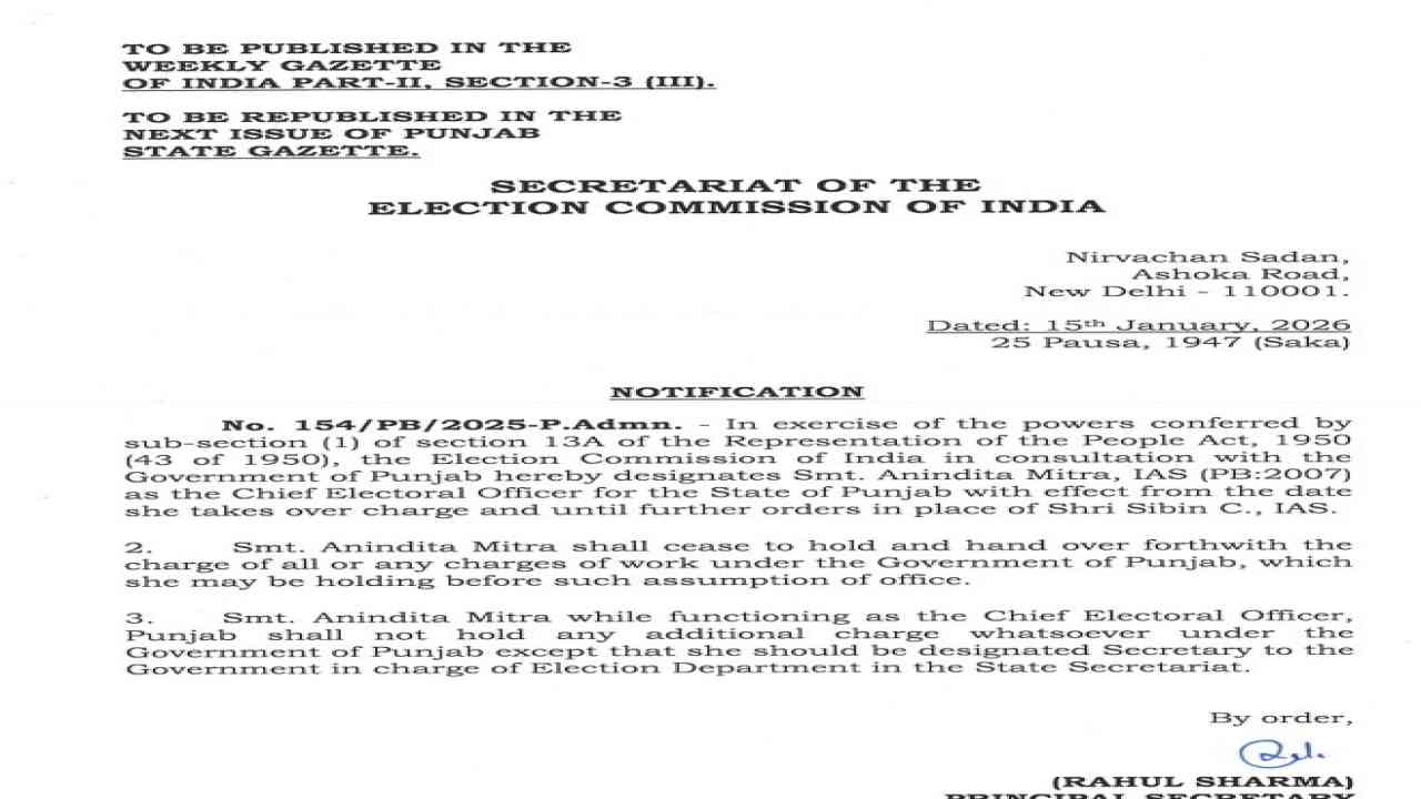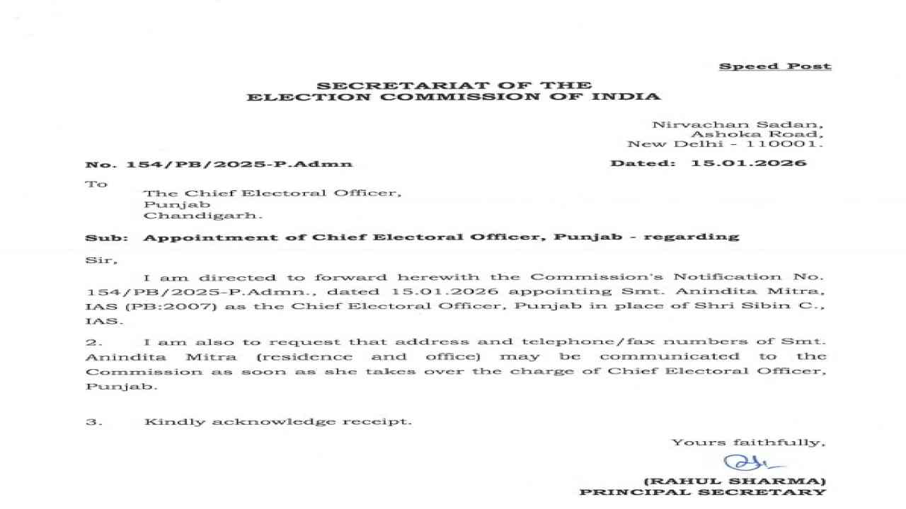 ਭਾਰਤ ਦੇ ਚੋਣ ਕਮਿਸ਼ਨ ਨੇ ਵੀਰਵਾਰ ਨੂੰ ਇੱਕ ਮਹੱਤਵਪੂਰਨ ਪ੍ਰਸ਼ਾਸਕੀ ਫੈਸਲਾ ਲੈਂਦਿਆਂ 2007 ਬੈਚ ਦੀ ਪੰਜਾਬ ਕੇਡਰ ਦੀ ਆਈ.ਏ.ਐਸ. ਅਧਿਕਾਰੀ ਅਨਿੰਦਿਤਾ ਮਿੱਤਰਾ ਨੂੰ ਪੰਜਾਬ ਦੀ ਨਵੀਂ ਮੁੱਖ ਚੋਣ ਅਧਿਕਾਰੀ (Chief Electoral Officer – CEO) ਨਿਯੁਕਤ ਕੀਤਾ ਹੈ। ਇਸ ਨਿਯੁਕਤੀ ਨਾਲ ਸੂਬੇ ਵਿੱਚ ਚੋਣ ਪ੍ਰਕਿਰਿਆ ਨੂੰ ਹੋਰ ਪਾਰਦਰਸ਼ੀ, ਨਿਰਪੱਖ ਅਤੇ ਪ੍ਰਭਾਵਸ਼ਾਲੀ ਬਣਾਉਣ ਦੀ ਉਮੀਦ ਜਤਾਈ ਜਾ ਰਹੀ ਹੈ।