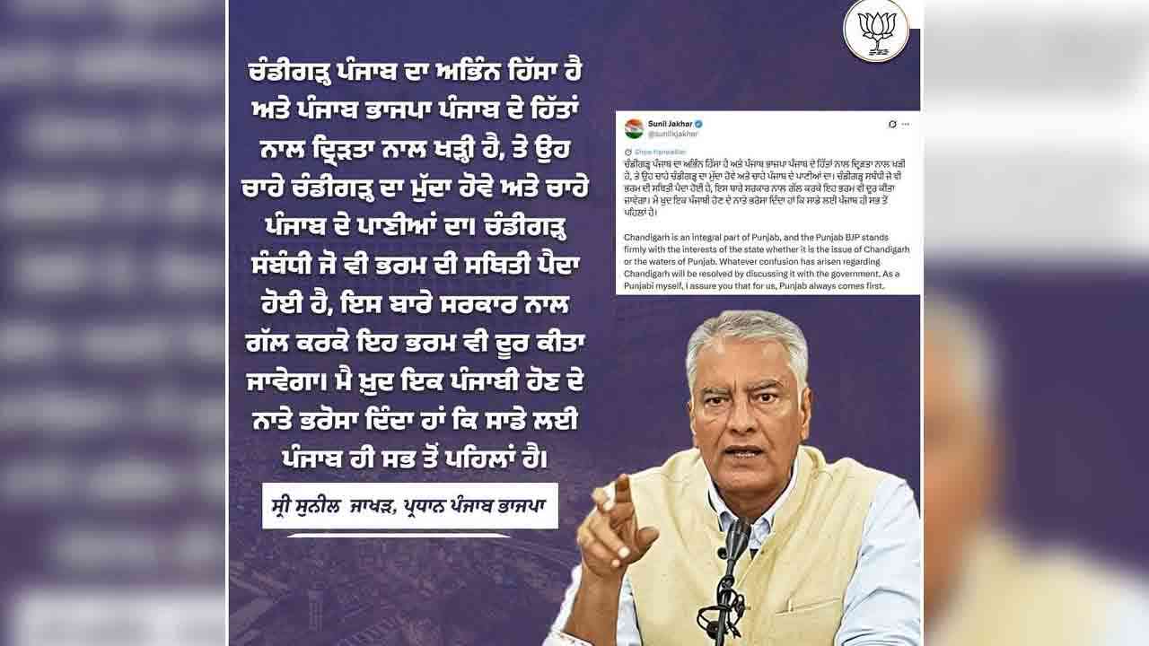 ਉਧਰ ਚੰਡੀਗੜ੍ਹ ਨੂੰ ਹੋਰ ਕੇਂਦਰ ਸ਼ਾਸਿਤ ਪ੍ਰਦੇਸ਼ਾਂ ਦੀ ਸ਼੍ਰੇਣੀ ਵਿੱਚ ਸ਼ਾਮਿਲ ਕਰਨ ਦੇ ਤਜਵੀਜ਼ਤ ਬਿੱਲ ਨੂੰ ਲੈ ਕੇ ਚੱਲ ਰਹੇ ਸਿਆਸੀ ਹੰਗਾਮੇ ਵਿਚਾਲੇ ਪੰਜਾਬ ਭਾਜਪਾ ਦੇ ਪ੍ਰਧਾਨ ਸੁਨੀਲ ਜਾਖੜ ਨੇ ਸਪਸ਼ਟ ਕੀਤਾ ਕਿ ਚੰਡੀਗੜ੍ਹ ਪੰਜਾਬ ਦਾ ਅਭਿੰਨ ਹਿੱਸਾ ਹੈ ਅਤੇ ਪੰਜਾਬ ਭਾਜਪਾ ਸੂਬੇ ਦੇ ਹਿੱਤਾਂ ਨਾਲ ਦ੍ਰਿੜਤਾ ਨਾਲ ਖੜੀ ਹੈ । ਉਹ ਭਾਵੇਂ ਚੰਡੀਗੜ੍ਹ ਦਾ ਮੁੱਦਾ ਹੋਵੇ ਜਾਂ ਪੰਜਾਬ ਦੇ ਪਾਣੀਆਂ ਦਾ । ਮੈਂ ਖੁਦ ਇੱਕ ਪੰਜਾਬੀ ਹੋਣ ਦੇ ਨਾਤੇ ਭਰੋਸਾ ਦਿੰਦਾ ਹਾਂ ਕਿ ਸਾਡੇ ਲਈ ਪੰਜਾਬ ਹੀ ਸਭ ਤੋਂ ਪਹਿਲਾਂ ਹੈ ।