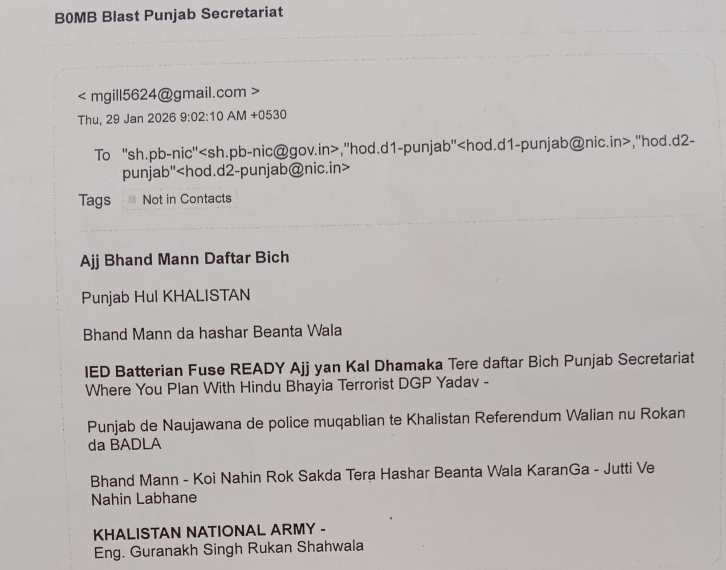 ਚੰਡੀਗੜ੍ਹ ਤੋਂ ਇੱਕ ਵੱਡੀ ਸੁਰੱਖਿਆ ਸੰਬੰਧੀ ਖ਼ਬਰ ਸਾਹਮਣੇ ਆਈ ਹੈ। ਚੰਡੀਗੜ੍ਹ ਸਥਿਤ ਪੰਜਾਬ ਸੈਕਟਰੀਏਟ ਅਤੇ ਮੇਨ ਸੈਕਟਰੀਏਟ ਪੰਜਾਬ ਤੇ ਹਰਿਆਣਾ ਨੂੰ ਬੰਬ ਨਾਲ ਉਡਾਉਣ ਦੀ ਧਮਕੀ ਮਿਲਣ ਤੋਂ ਬਾਅਦ ਪ੍ਰਸ਼ਾਸਨ ਪੂਰੀ ਤਰ੍ਹਾਂ ਅਲਰਟ ਮੋਡ ‘ਚ ਆ ਗਿਆ ਹੈ। ਧਮਕੀ ਮਿਲਦਿਆਂ ਹੀ ਚੰਡੀਗੜ੍ਹ ਪੁਲਿਸ, ਸੀਆਈਐਸਐਫ਼, ਬੰਬ ਸਕੁਆਡ ਅਤੇ ਹੋਰ ਸੁਰੱਖਿਆ ਏਜੰਸੀਆਂ ਨੂੰ ਤੁਰੰਤ ਮੌਕੇ ‘ਤੇ ਤੈਨਾਤ ਕਰ ਦਿੱਤਾ ਗਿਆ।