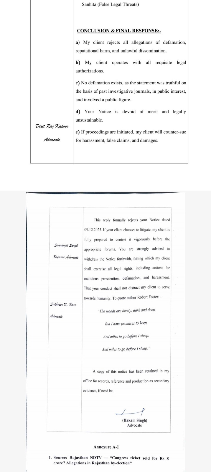 MP ਸੁਖਜਿੰਦਰ ਸਿੰਘ ਰੰਧਾਵਾ ਦੇ ਮੁਤਾਬਕ, ਡਾ. ਨਵਜੋਤ ਕੌਰ ਸਿੱਧੂ ਵੱਲੋਂ 7 ਅਤੇ 8 ਦਸੰਬਰ 2025 ਨੂੰ ਮੀਡੀਆ ’ਚ ਦਿੱਤੇ ਗਏ ਝੂਠੇ, ਬਿਨਾ ਸਬੂਤ ਅਤੇ ਅਪਮਾਨਜਨਕ ਬਿਆਨਾਂ ਦੇ ਸਖ਼ਤ ਵਿਰੋਧ ’ਚ ਉਨ੍ਹਾਂ ਨੂੰ ਕਾਨੂੰਨੀ ਨੋਟਿਸ ਭੇਜਿਆ ਗਿਆ ਹੈ। ਰੰਧਾਵਾ ਵੱਲੋਂ ਭੇਜੇ ਗਏ ਨੋਟਿਸ ’ਚ ਦਰਸਾਇਆ ਗਿਆ ਹੈ ਕਿ ਡਾ. ਸਿੱਧੂ ਵੱਲੋਂ ਰਾਜਸਥਾਨ ’ਚ ਪਾਰਟੀ ਟਿਕਟਾਂ ਦੀ ਵੰਡ ਦੌਰਾਨ ਭ੍ਰਿਸ਼ਟਾਚਾਰ ਦੇ ਲਗਾਏ ਗਏ ਇਲਜ਼ਾਮ ਪੂਰੀ ਤਰ੍ਹਾਂ ਝੂਠੇ ਘੜੇ ਹੋਏ ਅਤੇ ਰਾਜਨੀਤਿਕ ਦੁਸ਼ਮਨੀ ਤੋਂ ਪ੍ਰੇਰਿਤ ਹਨ। ।