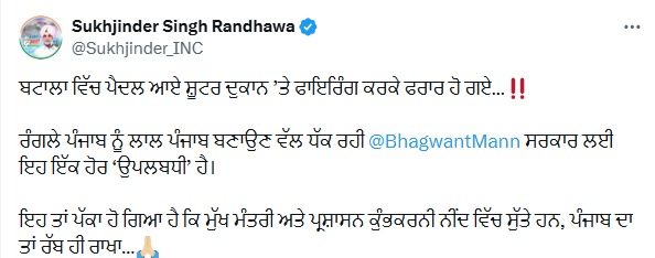 ਸਾਂਸਦ ਸੁਖਜਿੰਦਰ ਰੰਧਾਵਾਂ ਨੇ ਵੀ X ਪੋਸਟ ’ਚ ਸੂਬਾ ਸਰਕਾਰ ’ਤੇ ਨਿਸ਼ਾਨੇ ਸਾਧੇ ਨੇ, ਰੰਧਾਵਾ ਨੇ ਲਿਖਿਆ, ‘ਬਟਾਲਾ ਵਿੱਚ ਪੈਦਲ ਆਏ ਸ਼ੂਟਰ ਦੁਕਾਨ ’ਤੇ ਫਾਇਰਿੰਗ ਕਰਕੇ ਫਰਾਰ ਹੋ ਗਏ…ਰੰਗਲੇ ਪੰਜਾਬ ਨੂੰ ਲਾਲ ਪੰਜਾਬ ਬਣਾਉਣ ਵੱਲ ਧੱਕ ਰਹੀ ਸਰਕਾਰ ਲਈ ਇਹ ਇੱਕ ਹੋਰ ‘ਉਪਲਬਧੀ’ ਹੈ। ਇਹ ਤਾਂ ਪੱਕਾ ਹੋ ਗਿਆ ਹੈ ਕਿ ਮੁੱਖ ਮੰਤਰੀ ਅਤੇ ਪ੍ਰਸ਼ਾਸਨ ਕੁੰਭਕਰਨੀ ਨੀਂਦ ਵਿੱਚ ਸੁੱਤੇ ਹਨ, ਪੰਜਾਬ ਦਾ ਤਾਂ ਰੱਬ ਹੀ ਰਾਖਾ’