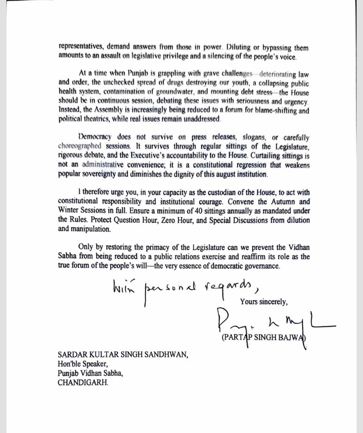 ਬਾਜਵਾ ਨੇ X ਪੋਸਟ ’ਚ ਲਿਖਿਆ, ‘ਮੈਂ ਮਾਨਯੋਗ ਸਪੀਕਰ ਕੁਲਤਾਰ ਸੰਧਵਾਂ ਨੂੰ ਪੱਤਰ ਲਿਖਿਆ ਹੈ, ਜਿਸ ’ਚ ਨਿਯਮਤ ਸੈਸ਼ਨਾਂ ਦੀ ਬਹਾਲੀ, ਸਾਲਾਨਾ ਘੱਟੋ-ਘੱਟ 40 ਬੈਠਕਾਂ, ਅਤੇ ਵਿਧਾਨ ਸਭਾ ਦੀ ਸੰਵਿਧਾਨਕ ਪ੍ਰਮੁੱਖਤਾ ਦੀ ਰੱਖਿਆ ਦੀ ਅਪੀਲ ਕੀਤੀ ਗਈ ਹੈ। ਲੋਕਤੰਤਰ ਸਿਰਫ਼ ਨਾਅਰਿਆਂ ਅਤੇ ਪ੍ਰਕਾਸ਼ਾਂ 'ਤੇ ਨਹੀਂ ਟਿਕ ਸਕਦਾ।’