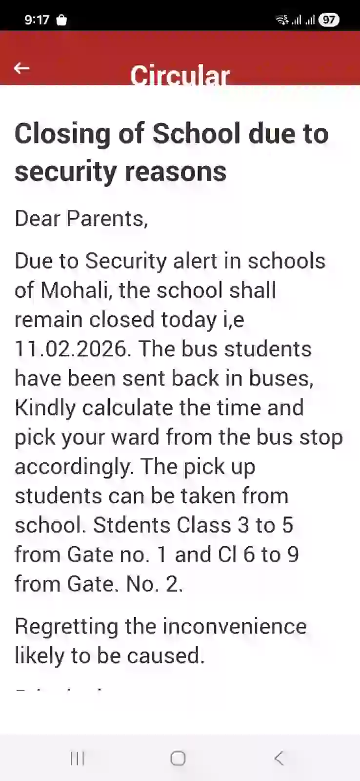 मानव मंगल स्मार्ट स्कूल, पैरागन, शेमरॉक इंटरनेशनल सेक्टर 69 और फेज 10 स्थित डीएवी स्कूल में छुट्टी घोषित कर दी गई है। आज सुबह स्कूल खुलने के थोड़ी देर बाद कई स्कूलों को ईमेल प्राप्त हुए। पुलिस टीमें तुरंत अलर्ट पर आ गईं और स्कूलों को बंद घोषित कर दिया गया। जो अभिभावक अपने बच्चों को स्कूल छोड़ने पहुंचे थे, उन्हें स्कूल के बाहर से ही वापस भेज दिया गया।