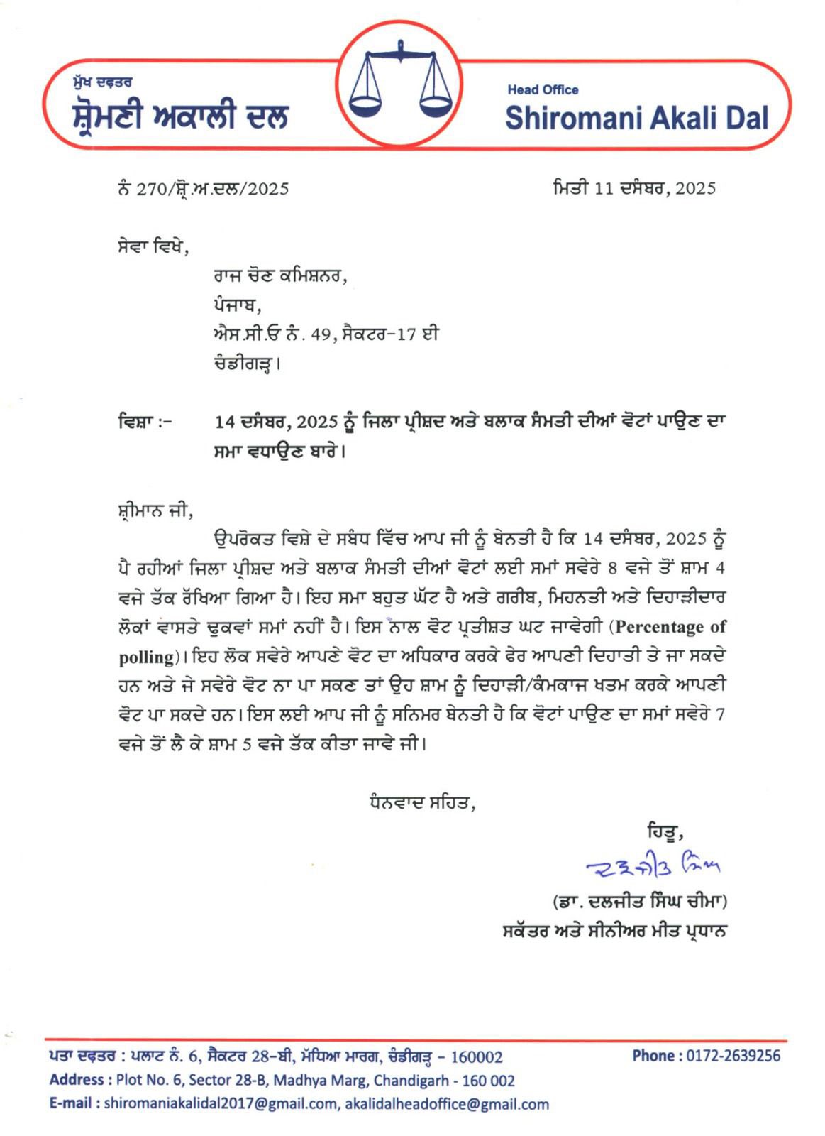 ਪੰਜਾਬ ਵਿੱਚ ਜ਼ਿਲ੍ਹਾ ਪ੍ਰੀਸ਼ਦ ਅਤੇ ਪੰਚਾਇਤ ਸੰਮਤੀ ਚੋਣਾਂ 14 ਦਸੰਬਰ ਨੂੰ ਹੋਣ ਜਾ ਰਹੀਆਂ ਹਨ, ਜਿਸ ਨੂੰ ਲੈ ਕੇ ਵੱਖ-ਵੱਖ ਸਿਆਸੀ ਪਾਰਟੀਆਂ ਵੱਲੋਂ ਚੋਣ ਪ੍ਰਚਾਰ ਸਿਖਰਾਂ ਉੱਤੇ ਕੀਤਾ ਜਾ ਰਿਹਾ ਹੈ। ਉੱਥੇ ਹੀ ਸ਼੍ਰੋਮਣੀ ਅਕਾਲੀ ਦਲ ਦੇ ਸੀਨੀਅਰ ਆਗੂ ਡਾ. ਦਲਜੀਤ ਸਿੰਘ ਚੀਮਾ ਨੇ ਵੋਟਿੰਗ ਸਮੇਂ 'ਤੇ ਗੰਭੀਰ ਚਿੰਤਾ ਪ੍ਰਗਟਾਈ ਹੈ। ਸ਼੍ਰੋਮਣੀ ਅਕਾਲੀ ਦਲ ਨੇ ਵੋਟਿੰਗ ਸਮੇਂ ਵਿੱਚ ਵਾਧਾ ਕਰਨ ਲਈ ਚੋਣ ਕਮਿਸ਼ਨ ਨੂੰ ਪੱਤਰ ਲਿਖਿਆ ਹੈ।