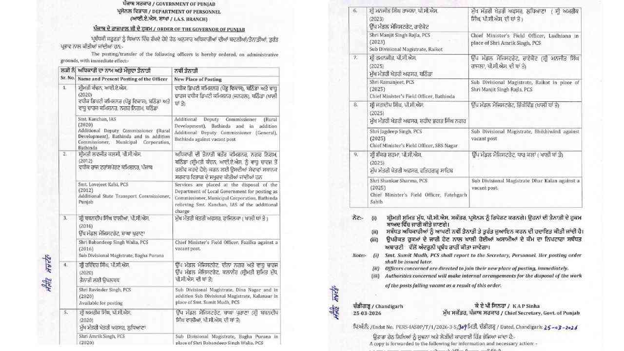 Punjab News: ਪੰਜਾਬ ਪ੍ਰਸ਼ਾਸਨ ‘ਚ ਵੱਡਾ ਫੇਰਬਦਲ: ਇੱਕ IAS ਅਤੇ 8 PCS ਅਧਿਕਾਰੀਆਂ ਦੇ ਤਬਾਦਲੇ, ਵਿਵਾਦਾਂ ‘ਚ ਰਹੇ SDM ਬਬਨਦੀਪ ਵਾਲੀਆ ਦਾ ਵੀ ਟ੍ਰਾਂਸਫਰ