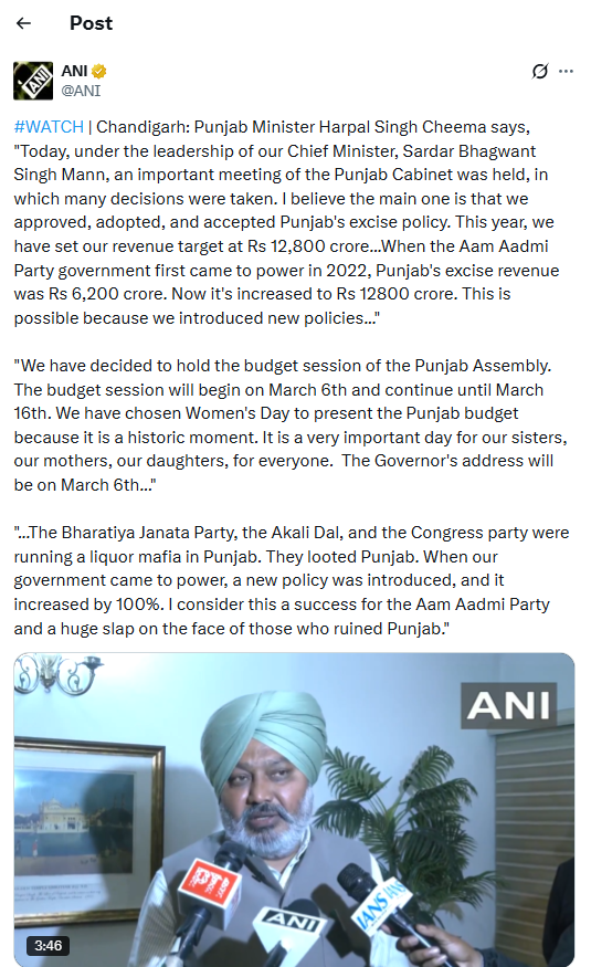 पंजाब: पंजाब मंत्रिमंडल ने सोमवार को सरकारी जमीन पर खेती करने वाले उन किसानों के लिए मुआवजे को मंजूरी दे दी, जिन्हें पिछले साल अगस्त-सितंबर में राज्य में आई बाढ़ के दौरान नुकसान हुआ था। पंजाब के वित्त मंत्री हरपाल सिंह चीमा ने कहा, "आज हमारे मुख्यमंत्री सरदार भगवंत सिंह मान की लीडरशिप में पंजाब कैबिनेट की एक ज़रूरी मीटिंग हुई, जिसमें कई फ़ैसले लिए गए। मेरा मानना है कि सबसे ज़रूरी फ़ैसला यह है कि हमने पंजाब की एक्साइज़ पॉलिसी को मंज़ूरी दी, अपनाया और माना। इस साल, हमने अपना रेवेन्यू टारगेट ₹12,800 करोड़ रखा है। जब आम आदमी पार्टी की सरकार 2022 में पहली बार सत्ता में आई थी, तो पंजाब का एक्साइज़ रेवेन्यू ₹6,200 करोड़ था। अब यह बढ़कर ₹12,800 करोड़ हो गया है। यह इसलिए मुमकिन हुआ क्योंकि हमने नई पॉलिसी लाईं।"