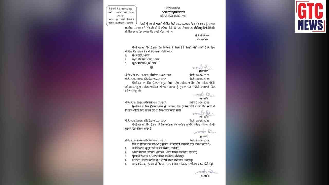 ਇਸ ਮੀਟਿੰਗ ਨੂੰ ਲੈ ਕੇ ਸਰਕਾਰੀ ਪੱਤਰ ਵੀ ਜਾਰੀ ਕੀਤਾ ਗਿਆ ਹੈ। ਇਸ ਅਨੁਸਾਰ ਮੰਤਰੀ ਪ੍ਰੀਸ਼ਦ ਦੀ ਅਗਲੀ ਮੀਟਿੰਗ 28 ਅਪ੍ਰੈਲ 2026, ਦਿਨ ਮੰਗਲਵਾਰ ਨੂੰ ਦੁਪਹਿਰ 03:30 ਵਜੇ ਰੱਖੀ ਗਈ ਹੈ। ਇਹ ਮੀਟਿੰਗ ਚੰਡੀਗੜ੍ਹ ਦੇ ਸੈਕਟਰ-2 ਵਿੱਚ ਸਥਿਤ ਮੁੱਖ ਮੰਤਰੀ ਦੀ ਰਿਹਾਇਸ਼ (ਕੋਠੀ ਨੰਬਰ 45) ਵਿਖੇ ਹੋਵੇਗੀ। ਮੁੱਖ ਸਕੱਤਰ ਕੇ.ਏ.ਪੀ. ਸਿਨਹਾ ਵੱਲੋਂ ਜਾਰੀ ਇਸ ਪੱਤਰ ਵਿੱਚ ਦੱਸਿਆ ਗਿਆ ਹੈ ਕਿ ਮੀਟਿੰਗ ਦਾ ਏਜੰਡਾ ਬਾਅਦ ਵਿੱਚ ਸਾਂਝਾ ਕੀਤਾ ਜਾਵੇਗਾ। ਇਸ ਮੀਟਿੰਗ ਵਿੱਚ ਸ਼ਾਮਲ ਹੋਣ ਲਈ ਮੁੱਖ ਮੰਤਰੀ, ਸਮੂਹ ਕੈਬਨਿਟ ਮੰਤਰੀਆਂ ਅਤੇ ਪ੍ਰਮੁੱਖ ਸਕੱਤਰਾਂ ਨੂੰ ਸੂਚਿਤ ਕਰ ਦਿੱਤਾ ਗਿਆ ਹੈ।