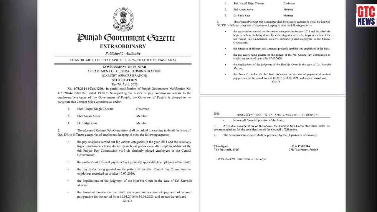 ਪੰਜਾਬ ਦੇ ਮੁਲਾਜ਼ਮਾਂ ਲਈ ਵੱਡੀ ਖ਼ਬਰ: DA ਅਤੇ ਪੇਅ-ਕਮਿਸ਼ਨ ਦੇ ਬਕਾਏ ਲਈ ਕੈਬਨਿਟ ਸਬ-ਕਮੇਟੀ ਗਠਿਤ; ਹਰਪਾਲ ਚੀਮਾ ਹੋਣਗੇ ਚੇਅਰਮੈਨ