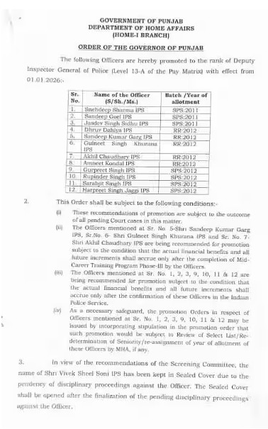ਪੰਜਾਬ ਸਰਕਾਰ ਦੇ ਗ੍ਰਹਿ ਮਾਮਲੇ ਵਿਭਾਗ ਵੱਲੋਂ ਜਾਰੀ ਹੁਕਮਾਂ ਮੁਤਾਬਕ ਕਈ IPS ਅਧਿਕਾਰੀਆਂ ਨੂੰ ਤਰੱਕੀ ਦੇ ਕੇ DIG ਦੇ ਅਹੁਦੇ ‘ਤੇ ਨਿਯੁਕਤ ਕੀਤਾ ਗਿਆ ਹੈ। ਇਹ ਹੁਕਮ ਪੇ ਮੈਟ੍ਰਿਕਸ ਲੈਵਲ 13-A ਅਧੀਨ 1 ਜਨਵਰੀ 2026 ਤੋਂ ਲਾਗੂ ਹੋ ਗਏ ਹਨ । ਹੁਕਮਾਂ ਮੁਤਾਬਕ ਸਨੇਹਦੀਪ ਸ਼ਰਮਾ, ਸੰਦੀਪ ਗੋਇਲ, ਜਸਦੇਵ ਸਿੰਘ ਸਿੱਧੂ, ਧਰੁਵ ਦਹੀਆ, ਸੰਦੀਪ ਕੁਮਾਰ ਗਰਗ, ਗੁਲਨੀਤ ਸਿੰਘ ਖੁਰਾਨਾ, ਅਖਿਲ ਚੌਧਰੀ, ਅਮਨਦੀਪ ਕੌਂਡਲ, ਗੁਰਪ੍ਰੀਤ ਸਿੰਘ, ਰੁਪਿੰਦਰ ਸਿੰਘ, ਸਰਬਜੀਤ ਸਿੰਘ ਅਤੇ ਹਰਪ੍ਰੀਤ ਸਿੰਘ ਜੱਗੀ ਨੂੰ DIG ਦੇ ਅਹੁਦੇ ਲਈ ਤਰੱਕੀ ਦਿੱਤੀ ਗਈ ਹੈ। ਤਰੱਕੀ ਪ੍ਰਾਪਤ ਕਰਨ ਵਾਲੇ ਅਧਿਕਾਰੀਆਂ ਦੇ ਨਾਮਾਂ ਦੀ ਪੂਰੀ ਸੂਚੀ ਹੇਠਾਂ ਦਿੱਤੀ ਗਈ ਹੈ।