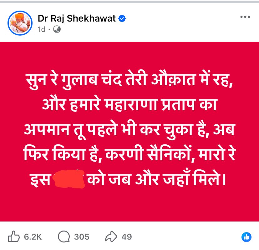 ਚੰਡੀਗੜ੍ਹ: ਪੰਜਾਬ ਦੇ ਰਾਜਪਾਲ ਗੁਲਾਬਚੰਦ ਕਟਾਰੀਆ ਨੂੰ ਸੋਸ਼ਲ ਮੀਡੀਆ 'ਤੇ ਧਮਕੀ ਦਿੱਤੀ ਗਈ ਹੈ, ਜਿਸ ਵਿੱਚ ਕਰਨੀ ਸੈਨਾ ਦੇ ਪ੍ਰਧਾਨ ਨੇ ਲਿਖਿਆ ਹੈ, "ਉਹ ਜਿੱਥੇ ਵੀ ਮਿਲੇ ਉਸਨੂੰ ਮਾਰ ਦਿਓ।"ਤੁਹਾਨੂੰ ਦੱਸ ਦਈਏ ਇਹ ਧਮਕੀ ਖੱਤਰੀ ਕਰਨੀ ਸੈਨਾ ਦੇ ਰਾਸ਼ਟਰੀ ਪ੍ਰਧਾਨ ਰਾਜ ਸ਼ੇਖਾਵਤ ਵੱਲੋਂ ਸੋਸ਼ਲ ਮੀਡੀਆ ‘ਤੇ ਪੋਸਟ ਰਾਹੀ ਦਿੱਤੀ ਹੈ ਜਿਸ ਵਿੱਚ ਉਨ੍ਹਾਂ ਲਿਖਿਆ, "ਸੁਣੋ, ਗੁਲਾਬਚੰਦ, ਆਪਣੀ ਹੱਦ ਵਿੱਚ ਰਹੋ, ਤੁਸੀਂ ਪਹਿਲਾਂ ਵੀ ਸਾਡੇ ਮਹਾਰਾਣਾ ਪ੍ਰਤਾਪ ਦਾ ਅਪਮਾਨ ਕੀਤਾ ਹੈ ਤੇ ਹੁਣ ਵੀ ਅਪਮਾਨ ਕੀਤਾ ਹੈ”,ਕਰਨੀ ਸੈਨਾ ਦੇ ਸਿਪਾਹੀ, ਉਸਨੂੰ ਜਦੋਂ ਵੀ ਅਤੇ ਜਿੱਥੇ ਵੀ ਮਿਲੇ ਮਾਰ ਦਿਓ।" ਇਹ ਸ਼ਬਦ ਰਾਜ ਸ਼ੇਖਾਵਤ ਦੀ ਪੋਸਟ ਦੇ ਹਨ।