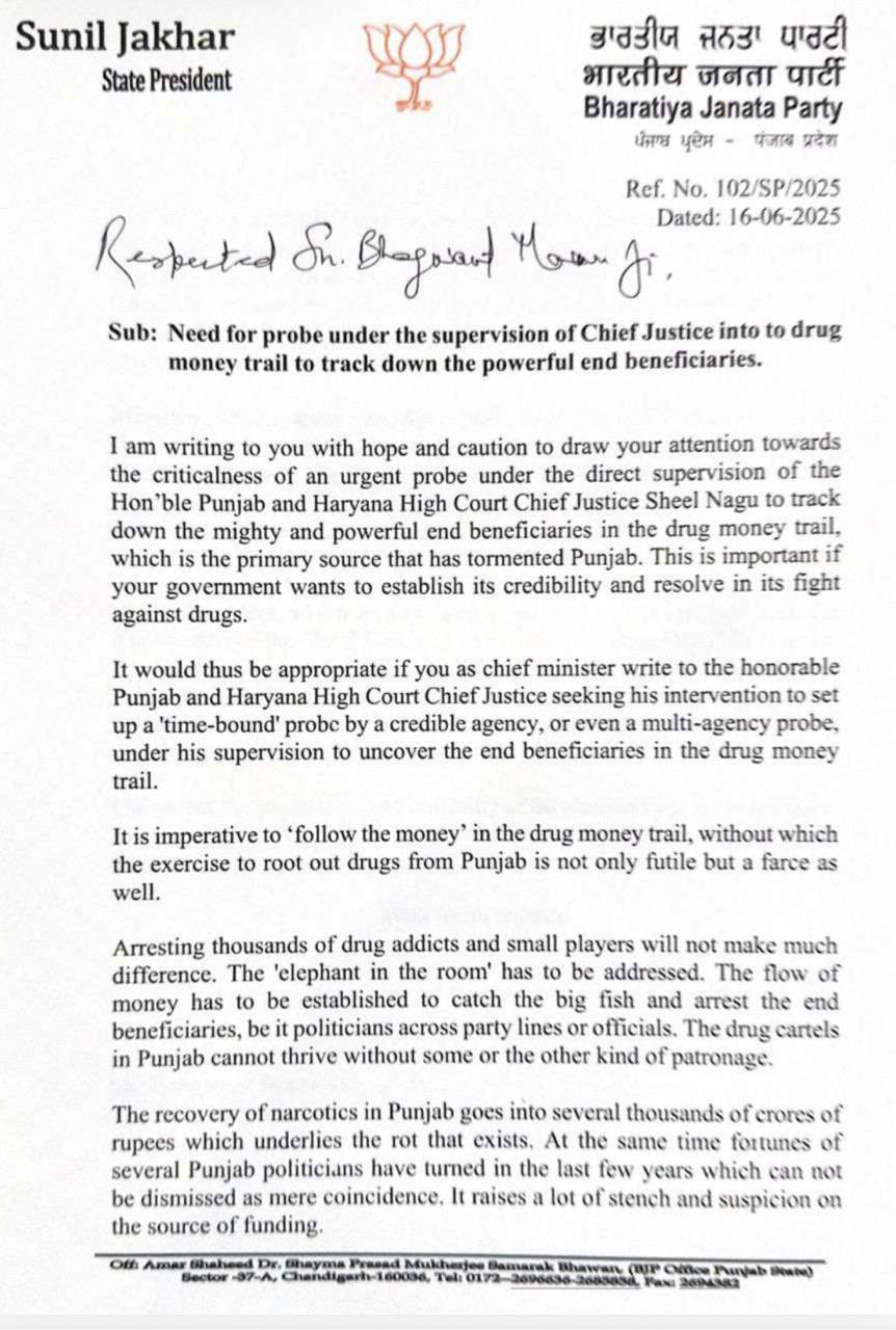 ਪੰਜਾਬ ਦੀ ਸਿਆਸਤ ਵਿੱਚ ਨਵਜੋਤ ਕੌਰ ਸਿੱਧੂ ਦੇ ਬਿਆਨ ਮਗਰੋਂ ਮੁੜ ਘਮਸਾਨ ਸ਼ੁਰੂ ਹੋ ਗਿਆ ਹੈ। ਅਜਿਹੇ ਵਿੱਚ ਪੰਜਾਬ ਭਾਜਪਾ ਪ੍ਰਧਾਨ ਸੁਨੀਲ ਜਾਖੜ ਨੇ ਮੁੱਖ ਮੰਤਰੀ ਭਗਵੰਤ ਮਾਨ ਨੂੰ ਚਿੱਠੀ ਲਿਖ ਕੇ ਸੂਬੇ ਵਿੱਚ ਡਰੱਗ ਮਨੀ ਟਰੇਲ ਦੀ ਜਾਂਚ ਪੰਜਾਬ-ਹਰਿਆਣਾ ਹਾਈਕੋਰਟ ਦੇ ਚੀਫ਼ ਜਸਟਿਸ ਦੀ ਨਿਗਰਾਨੀ ਹੇਠ ਸਮਾਂਬੱਧ ਜਾਂਚ ਕਰਵਾਉਣ ਦੀ ਮੰਗ ਕੀਤੀ ਹੈ । ਸੁਨੀਲ ਜਾਖੜ ਨੇ ਕਿਹਾ ਕਿ ਸੂਬੇ ਵਿੱਚ ਭ੍ਰਿਸ਼ਟਾਚਾਰ ਦੀ ਜੜ੍ਹਾਂ ਮਨੀ ਟਰੇਲ ਵਿੱਚ ਲੁਕੀਆਂ ਹੋਈਆਂ ਹਨ ।