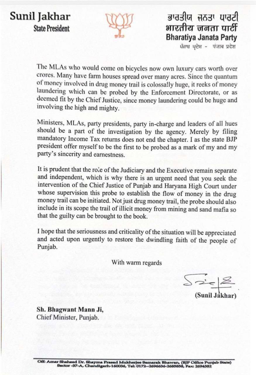ਸੁਨੀਲ ਜਾਖੜ ਨੇ ਆਪਣੀ ਚਿੱਠੀ ਵਿੱਚ ਲਿਖਿਆ ਕਿ ਸਿਰਫ ਨਸ਼ੇੜੀਆਂ ਜਾਂ ਛੋਟੇ ਸਪਾਇਲਰਾਂ ਨੂੰ ਗ੍ਰਿਫਤਾਰ ਕਰਨ ਨਾਲ ਪੰਜਾਬ ਵਿੱਚ ਨਸ਼ੇ ਦਾ ਖਾਤਮਾ ਨਹੀਂ ਹੋਵੇਗਾ, ਕਿਉਂਕਿ ਅਸਲੀ 'ਵੱਡੀ ਮੱਛੀਆਂ' ਹੁਣ ਵੀ ਕਾਨੂੰਨ ਤੋਂ ਬਾਹਰ ਹਨ । ਉਨ੍ਹਾਂ ਕਿਹਾ ਕਿ ਜੇ ਸਰਕਾਰ ਭਵਿੱਖ ਵਿੱਚ ਨਸ਼ਾ ਖਤਮ ਕਰਨਾ ਚਾਹੁੰਦੀ ਹੈ ਤਾਂ 'Follow the Money' ਦੇ ਸਿਧਾਂਤ 'ਤੇ ਜਾਂਚ ਜ਼ਰੂਰੀ ਹੈ । ਸੁਨੀਲ ਜਾਖੜ ਨੇ ਕਿਹਾ ਕਿ ਮੁੱਖ ਮੰਤਰੀ ਭਗਵੰਤ ਮਾਨ ਦੀ ਪ੍ਰਤੀਕਿਰਿਆ ਦਾ ਇੰਤਜ਼ਾਰ ਰਹੇਗਾ।