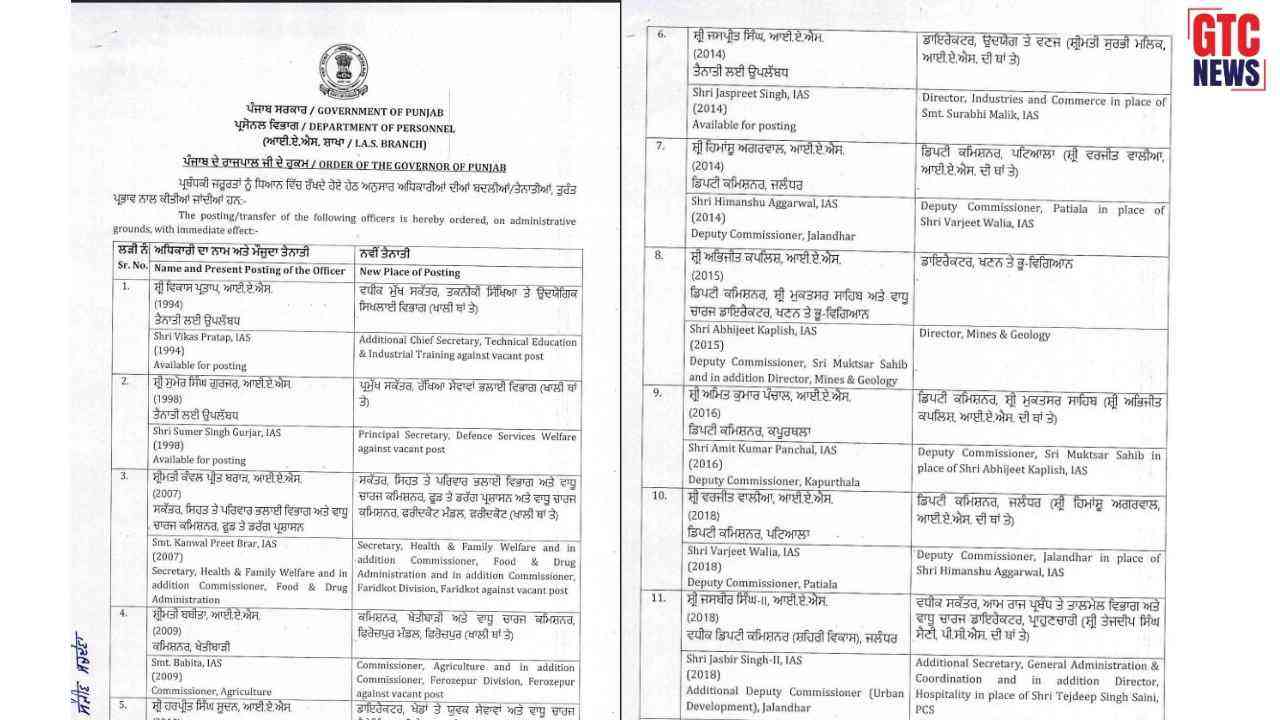 ਪੰਜਾਬ ਪ੍ਰਸ਼ਾਸਨ 'ਚ ਵੱਡਾ ਫੇਰਬਦਲ; 1 PCS ਤੇ 12 IAS ਅਧਿਕਾਰੀਆਂ ਦੇ ਤਬਾਦਲੇ; ਜਲੰਧਰ, ਪਟਿਆਲਾ ਸਣੇ 4 ਜ਼ਿਲ੍ਹਿਆਂ ਦੇ DC ਬਦਲੇ