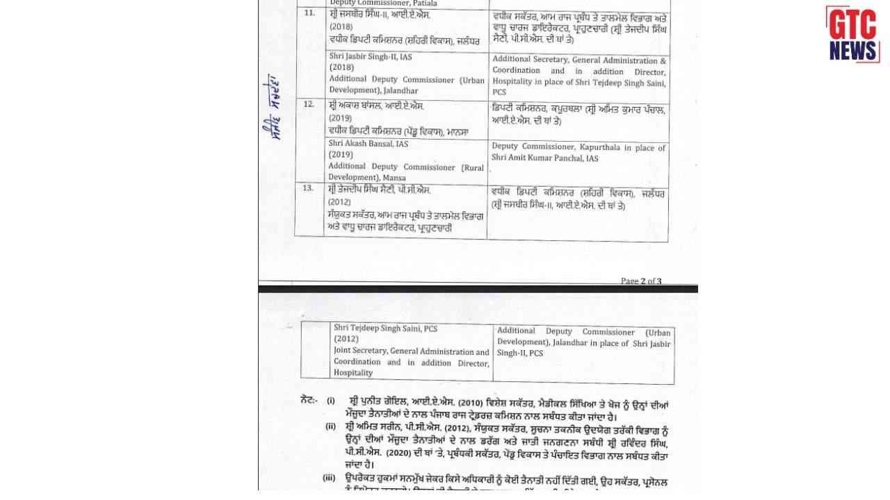 ਪੰਜਾਬ ਸਰਕਾਰ ਨੇ ਅੱਜ ਪ੍ਰਬੰਧਕੀ ਲੋੜਾਂ ਦੇ ਮੱਦੇਨਜ਼ਰ ਰਾਜ ਵਿੱਚ ਆਈ.ਏ.ਐਸ. (IAS) ਅਤੇ ਪੀ.ਸੀ.ਐਸ. (PCS) ਅਧਿਕਾਰੀਆਂ ਦੇ ਵੱਡੇ ਪੱਧਰ 'ਤੇ ਤਬਾਦਲੇ ਕੀਤੇ ਹਨ। ਜਾਰੀ ਕੀਤੇ ਗਏ ਸਰਕਾਰੀ ਹੁਕਮਾਂ ਅਨੁਸਾਰ ਕੁੱਲ 12 ਆਈ.ਏ.ਐਸ. ਅਤੇ 1 ਪੀ.ਸੀ.ਐਸ. ਅਧਿਕਾਰੀ ਦੀਆਂ ਤੈਨਾਤੀਆਂ ਵਿੱਚ ਬਦਲਾਅ ਕੀਤਾ ਗਿਆ ਹੈ।