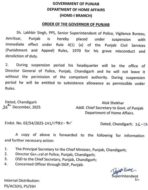 ਸ਼੍ਰੋਮਣੀ ਅਕਾਲੀ ਦਲ ਦੇ ਸੀਨੀਅਰ ਆਗੂ ਬਿਕਰਮ ਸਿੰਘ ਮਜੀਠੀਆ ਨੂੰ ਗ੍ਰਿਫ਼ਤਾਰ ਕਰਨ ਵਾਲੇ ਅੰਮ੍ਰਿਤਸਰ ਦੇ SSP ਵਿਜੀਲੈਂਸ ਖਿਲਾਫ਼ ਵੱਡਾ ਐਕਸ਼ਨ ਕੀਤਾ ਹੈ। ਪੰਜਾਬ ਸਰਕਾਰ ਨੇ SSP ਵਿਜੀਲੈਂਸ ਲਖਵੀਰ ਸਿੰਘ ਨੂੰ ਸਸਪੈਂਡ ਕਰ ਦਿੱਤਾ ਹੈ। ਸੂਤਰਾਂ ਅਨੁਸਾਰ, ਇਹ ਕਾਰਵਾਈ ਇੱਕ ਸੀਨੀਅਰ IAS ਅਧਿਕਾਰੀ ਦੀ ਸ਼ਿਕਾਇਤ ਤੋਂ ਬਾਅਦ ਕੀਤੀ ਗਈ ਹੈ। ਇਹ ਮਾਮਲਾ ਕਰੋੜਾਂ ਰੁਪਏ ਦੇ ਘਪਲੇ ਦੇ ਇੱਕ ਮਾਮਲੇ ਦੀ ਜਾਂਚ ਨਾਲ ਸਬੰਧਤ ਹੈ, ਜਿਸ ਵਿੱਚ ਜਾਂਚ 'ਤੇ ਸਵਾਲ ਉਠਾਏ ਜਾ ਰਹੇ ਸਨ। ਹਾਲਾਂਕਿ, ਪੰਜਾਬ ਸਰਕਾਰ ਵੱਲੋਂ ਇਸ ਬਾਰੇ ਅਜੇ ਤੱਕ ਕੋਈ ਰਸਮੀ ਆਦੇਸ਼ ਜਨਤਕ ਨਹੀਂ ਕੀਤੇ ਗਏ ਹਨ। ਲਖਬੀਰ ਸਿੰਘ ਨੂੰ ਇਸ ਸਾਲ ਮਾਰਚ ਵਿੱਚ SSP ਵਿਜੀਲੈਂਸ ਨਿਯੁਕਤ ਕੀਤਾ ਗਿਆ ਸੀ।