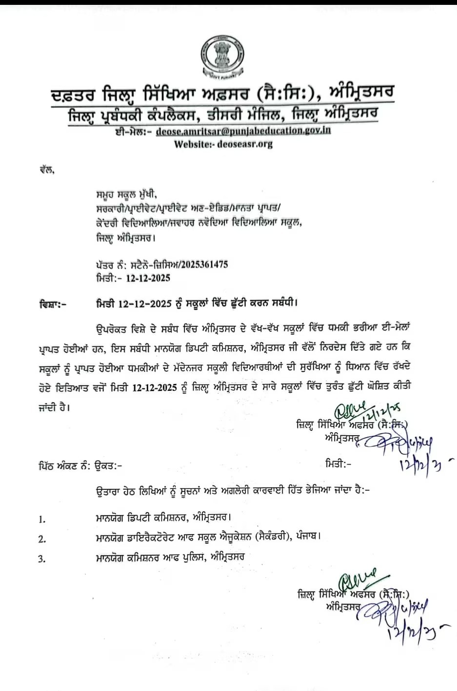 ਅੰਮ੍ਰਿਤਸਰ ਵਿੱਚ ਦਹਿਸ਼ਤ:-ਧਮਕੀ ਈਮੇਲ ਵਿੱਚ ਕੀ ਲਿਖਿਆ ਗਿਆ ਹੈ ਇਸ ਬਾਕੇ ਫਿਲਹਾਲ ਕੋਈ ਵੀ ਜਾਣਕਾਰੀ ਸਾਹਮਣੇ ਨਹੀਂ ਆਈ ਹੈ, ਪਰ ਅੰਮ੍ਰਿਤਸਰ ਵਿੱਚ ਧਮਕੀ ਮਿਲਣ ਨਾਲ ਦਹਿਸ਼ਤ ਤੋਂ ਮਾਹੌਲ ਬਣ ਗਿਆ। ਉੱਥੇ ਵੀ ਪੁਲਿਸ ਕਮਿਸ਼ਨਰ ਦਫ਼ਤਰ ਵੱਲੋਂ ਇਹ ਸੰਦੇਸ਼ ਦਿੱਤਾ ਗਿਆ ਕਿ ਪੇਂਡੂ ਅਤੇ ਸ਼ਹਿਰ ਦੇ ਕੁਝ ਸਕੂਲਾਂ ਨੂੰ ਇੱਕ ਕਥਿਤ ਈਮੇਲ ਪ੍ਰਾਪਤ ਹੋਈ ਹੈ। ਉੱਥੇ ਹੀ ਹਰ ਇੱਕ ਸਕੂਲ ਵਿੱਚ ਗਜ਼ਟਿਡ ਮੁਲਾਜ਼ਮ ਅਧਿਕਾਰੀ ਤਾਇਨਾਤ ਕੀਤਾ ਗਿਆ ਹੈ ਅਤੇ ਐਂਟੀ ਸੈਬੋਟਾਜ ਜਾਂਚ ਕੀਤੀ ਜਾ ਰਹੀ ਹੈ।